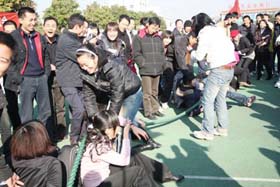 寒風(fēng)簌簌,陽光絢爛。在2008年12月6日這個(gè)寒冷而富有激情的日子里,我司第一屆冬季運(yùn)動(dòng)會火熱開展。為了充分調(diào)動(dòng)大家的激情,此次比賽項(xiàng)目的策劃可謂煞費(fèi)苦心。除了籃球賽、4*100接力賽、100米短跑、乒乓球比賽、等傳統(tǒng)比賽項(xiàng)目外,新增了很多趣味比賽項(xiàng)目如:趕小豬、兩人三足跑、夾球跑……大家玩得不亦樂乎!為了充分調(diào)動(dòng)大家積極性,我們?yōu)檫\(yùn)動(dòng)健兒們準(zhǔn)備了豐富的獎(jiǎng)品,有棉被、電蒸鍋、電熱水捂、手套、圍巾、領(lǐng)帶、保溫杯、指套裝、收音機(jī)、筆筒等等。我們還特設(shè)抽獎(jiǎng)環(huán)節(jié),每項(xiàng)比賽的前三名都會獲得一張“金卡”,拿著金卡可以抽獎(jiǎng),中獎(jiǎng)率為100%,未得金卡的選手們也將得到一份精美禮品。