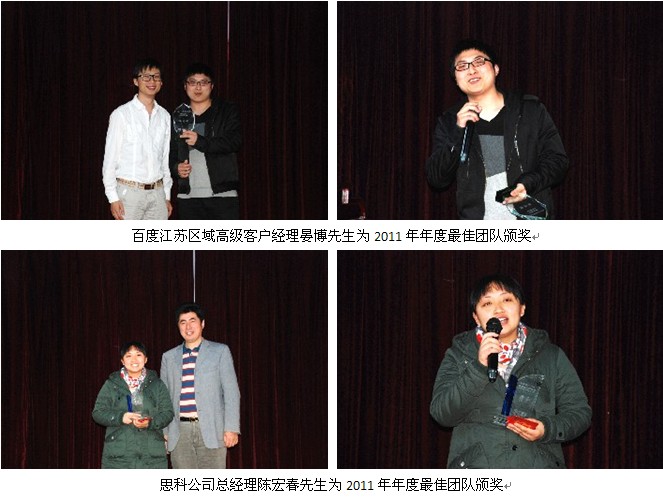 2012年4月17日下午4點(diǎn),鹽城思科客服部2011年度總結(jié)表彰活動(dòng)在公司大會(huì)議室隆重召開,本次活動(dòng)對(duì)2011年度的優(yōu)秀團(tuán)隊(duì)及個(gè)人分別進(jìn)行了表彰。百度江蘇區(qū)域高級(jí)客服經(jīng)理晏博及區(qū)域客服經(jīng)理張同二位領(lǐng)導(dǎo)也出席了本次活動(dòng),更加使所有員工充分體會(huì)到了這份榮譽(yù)的來之不易。